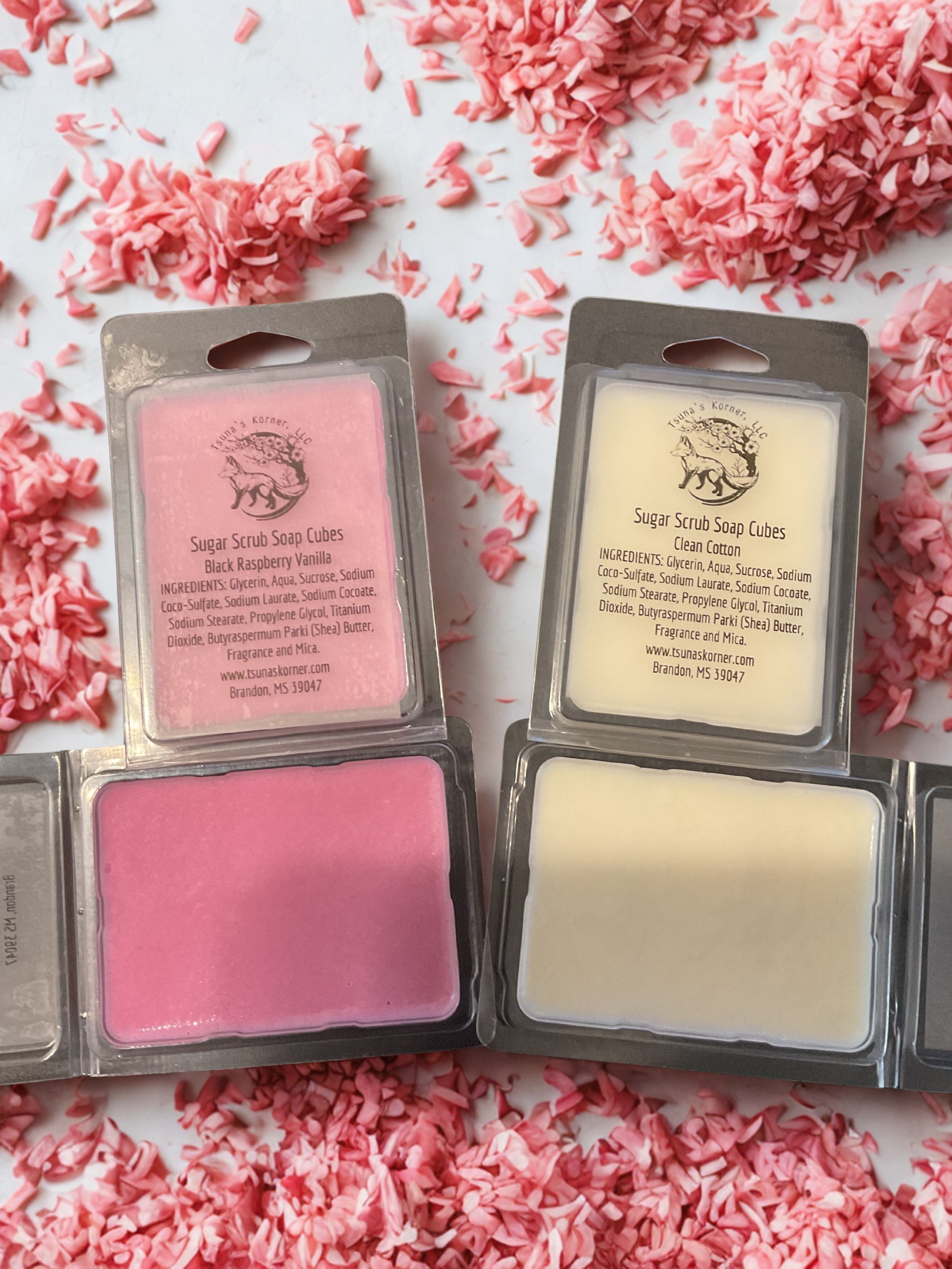 Need a quick soap to use at the gym or on the road?! Try our Sugar Scrub Soap Cubes! Versatile and easy to use. Packaged in a six-cavity clamshell for ease and convenience. Just break one out and use it in the shower. No loofah or wash cloth needed!